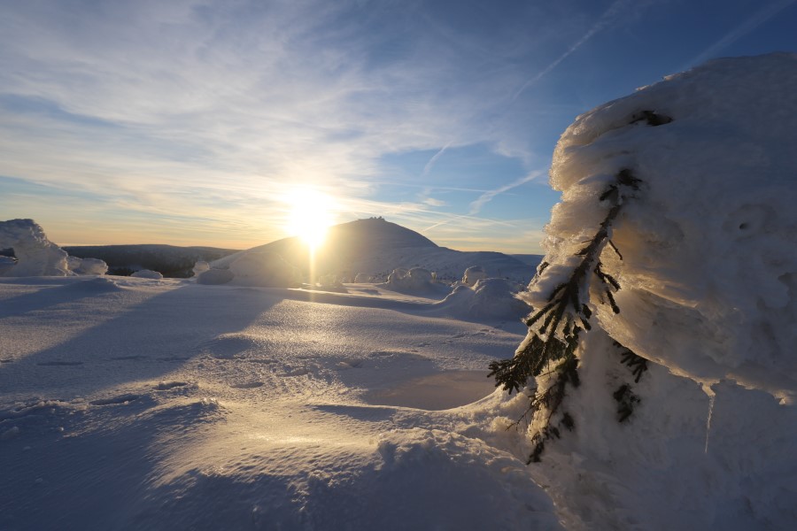 Am Hohen Rad waren wir schon fast auf 1500 m Höhe, oberhalb der Baumgrenze. Die erste technisch anspruchsvolle Abfahrt stand bevor. Steil im seitlich abfallenden leicht verharschten Gelände an der Südflanke des Hohen Rades konnten wir es keinesfalls laufen lassen. Langsam und vorsichtig im Schneepflug bergab, galt es darauf zu achten, das es die schmalen Ski nicht verschlägt und in den teils überraschenden Schneewehen der Körper das Gleichgewicht hält. Vor uns zeigte sich der Spindlerpass und in der Ferne bereits die 1602 m hohe Schneekoppe. Ein Panorama wie aus dem Reisekatalog. Am Spindlerpass machten wir kurz nach 13 Uhr einen kurzen Mittagsstop in der Spindlerova Bouda. Ich drängte auf zügige Weiterfahrt und wollte noch möglichst viel Sonnenschein mitnehmen. Am Spinderpass türmte sich der Schnee fast zwei Meter hoch. Das wir die Etappe komplett im Hellen schaffen würden, war ohnehin nicht mehr möglich. Dafür hatten wir aber vorgesorgt und Stirnlampen dabei. Etwa 10 km waren es noch bis zur Schneekoppe. 2 Stunden rechnete ich etwa.  Entlang der polnisch-tschechischen Grenze näherten wir uns dem höchsten Berg des Riesengebirges, in dessen Umgebung bei dem Prachtwetter allerhand Trubel war. An der Schlesischen Baude am Fuße der Schneekoppe machten wir die Ski ab und liefen die letzten Höhenmeter nach oben. Das Gelände ist hier einfach viel zu steil für Langlaufski. Am Kettenweg guckte von den Sicherheit und Halt gebenden Ketten gar nicht mehr soviel heraus. So viel Schnee hatte ich hier persönlich noch nicht erlebt. Ein wenig rutschig war es mit den Langlaufschuhen schon. Kurz nach 16 Uhr erreichten wir den Gipfel. Die langsam untergehende Sonne färbte die Schneefelder in einen warmen Weißton. Die Gebäude auf der Schneekoppe waren mit Reif bedeckt, wie wenn jemand fünf Schichten Spritzbeton an die Fassaden gesprüht hätte.